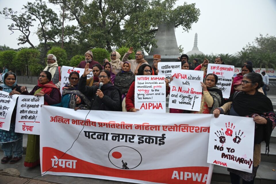 पटना। एक महिला डॉक्टर को प्रमाण-पत्र प्रदान करने के दौरान बिहार के मुख्यमंत्री द्वारा सरेआम उसका नक़ाब खींचे जाने की शर्मनाक घटना के विरोध में अखिल भारतीय प्रगतिशील महिला एसोसिएशन (ऐपवा) ने 19 दिसम्बर को पटना में बुद्ध स्मृति पार्क के पास ज़ोरदार प्रदर्शन किया।