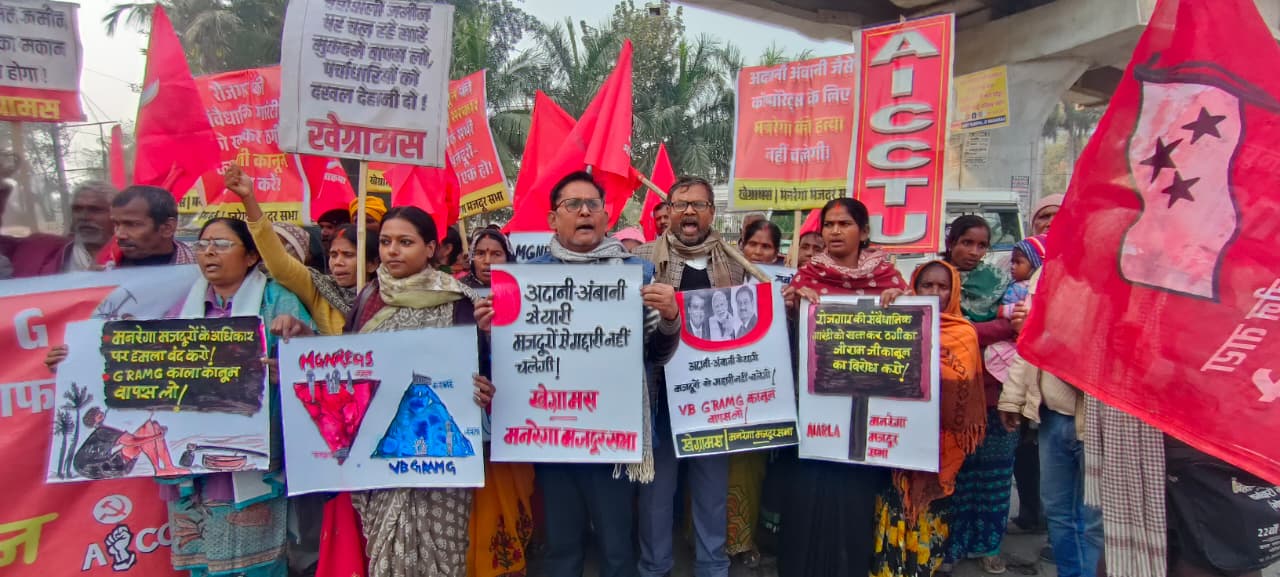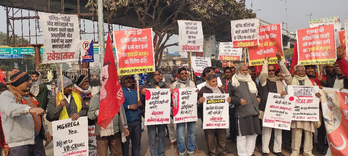पटना। मोदी सरकार द्वारा मनरेगा को खत्म कर उसकी जगह ग्रामजी (विकसित भारत–गारंटी फॉर रोजगार एवं आजीविका मिशन ग्रामीण) कानून को रद्द करने, मनरेगा की पुनर्बहाली, ग्रामीण गरीबों के रोजगार अधिकार की रक्षा तथा बुलडोजर कार्रवाई पर तत्काल रोक की मांग को लेकर खेग्रामस (अखिल भारतीय खेत एवं ग्रामीण मजदूर सभा ) ने आज पूरे बिहार में राज्यव्यापी विरोध प्रदर्शन किया।