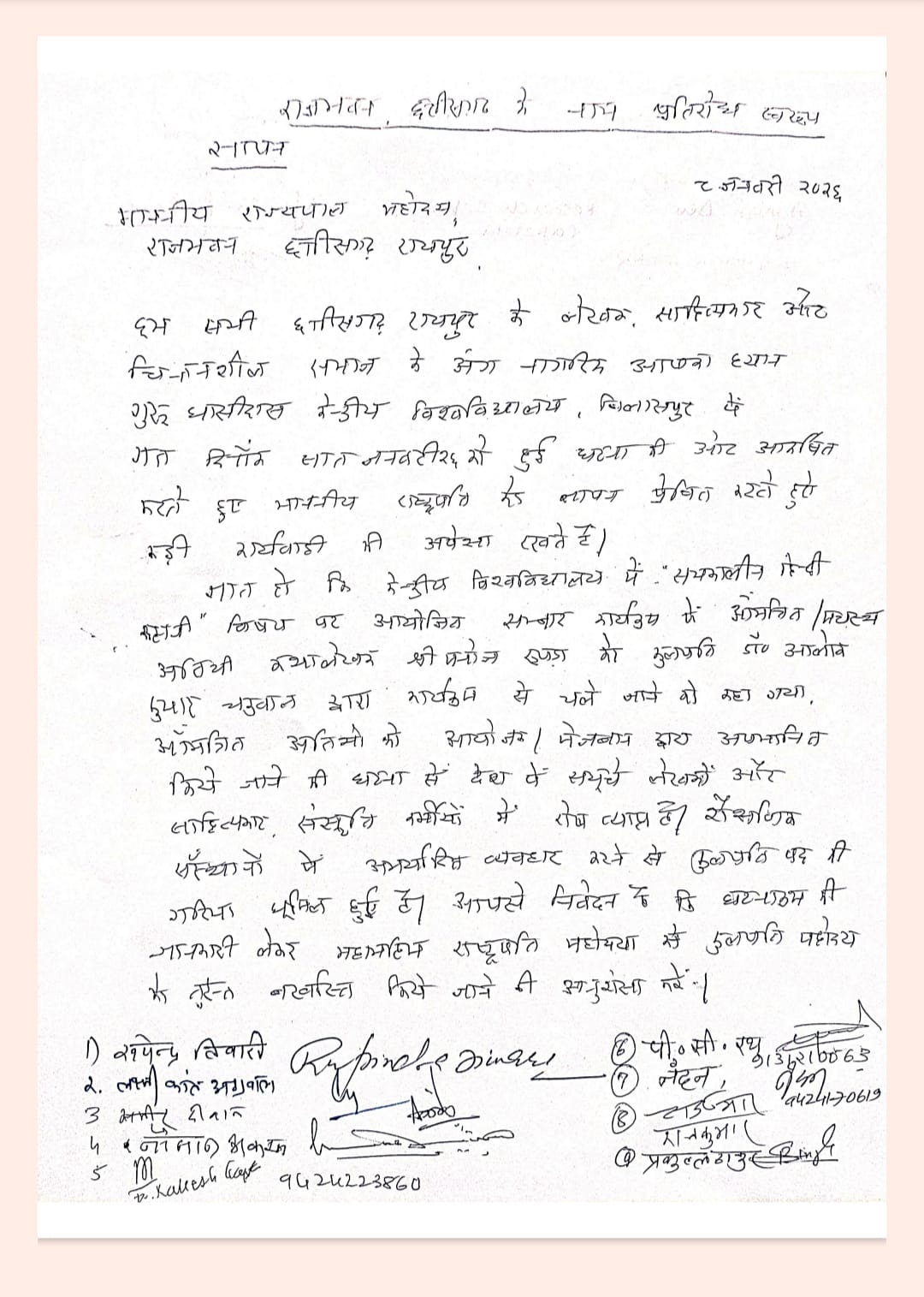 रायपुर। वरिष्ठ कथाकार-उपन्यासकार मनोज रुपड़ा से बदसलूकी करने वाले कुलपति आलोक चक्रवाल को हटाने की मांग को लेकर छत्तीसगढ़ के रायपुर में लेखक-संस्कृतिकर्मियों और पत्रकारों ने आज सड़क पर उतरकर प्रतिवाद दर्ज किया और राष्ट्रपति के नाम पर राज्यपाल को ज्ञापन सौंपा।